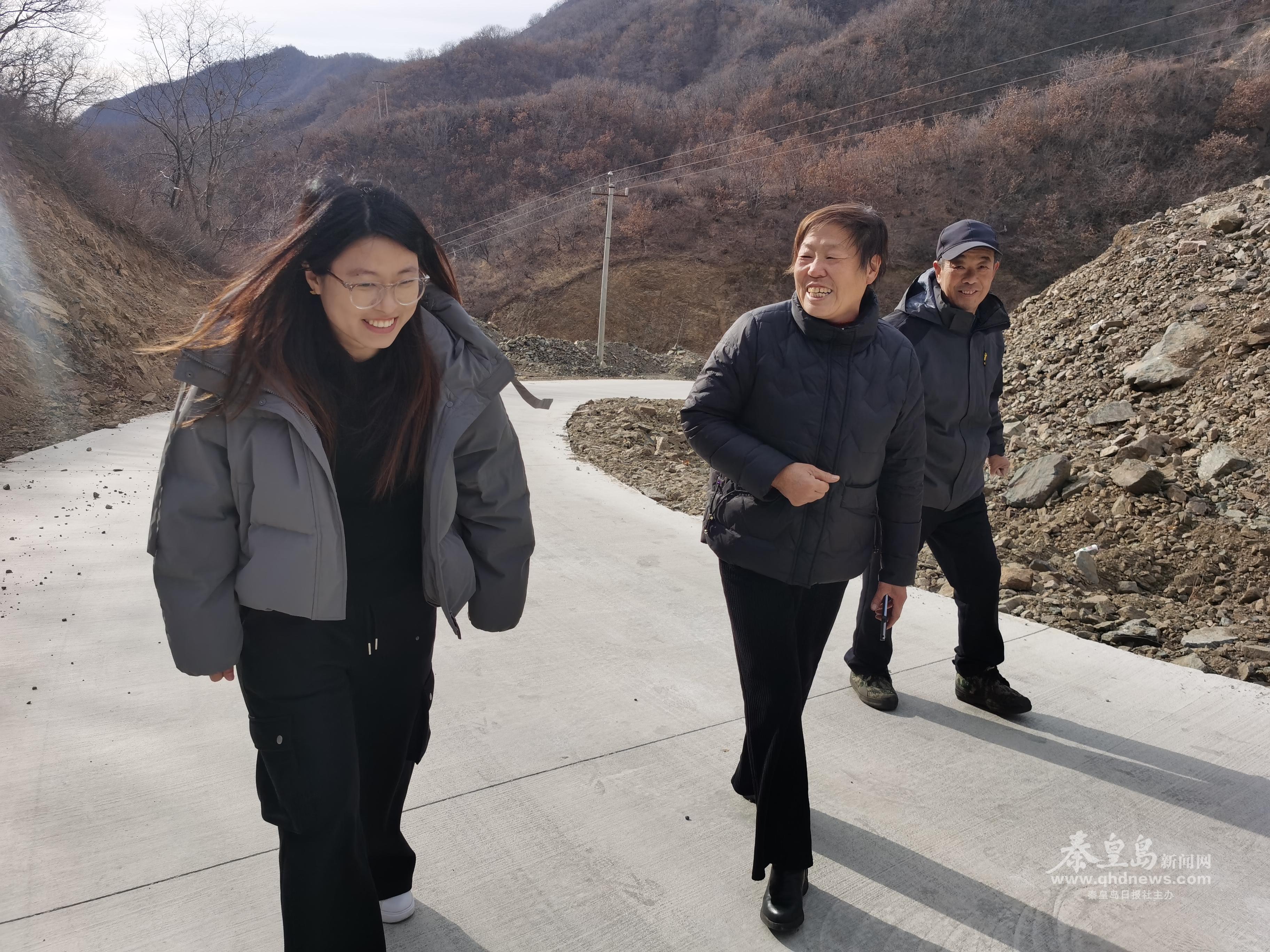 走在新修的路上,村民紛紛對唐亞楠(左)豎起大拇指。 記者 劉建楠 攝