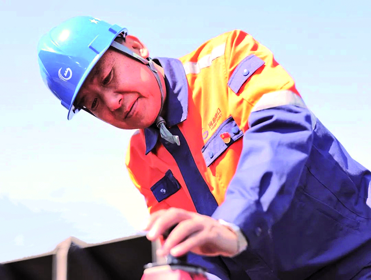 馮濤在施工作業(yè)前,現(xiàn)場檢查鋰電螺栓扳手狀況。(圖片由秦港股份提供)