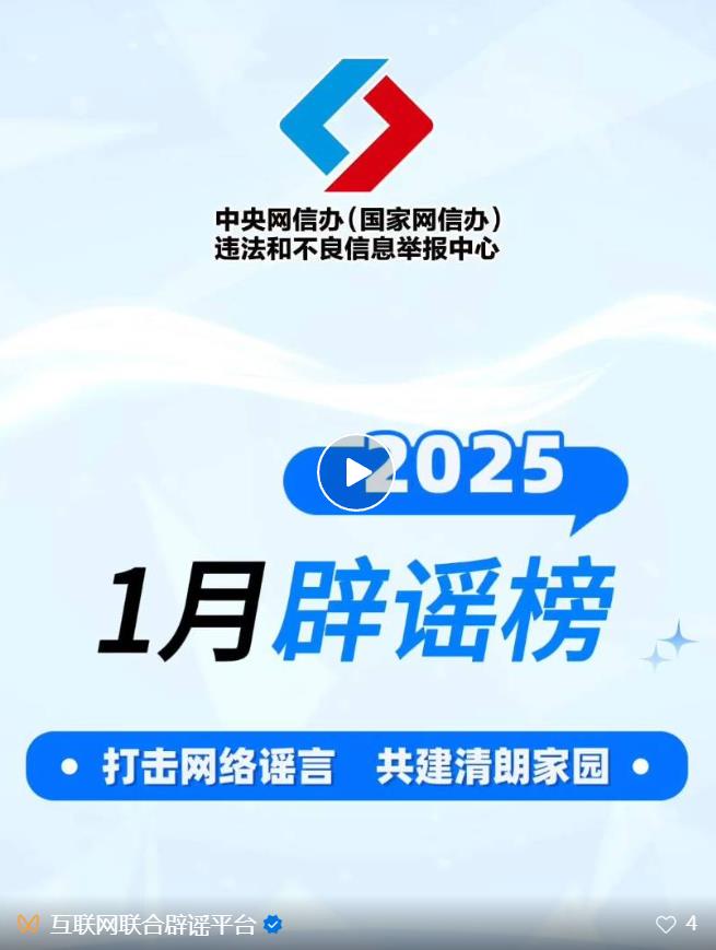 打擊網(wǎng)絡(luò)謠言 共建清朗家園 中國(guó)互聯(lián)網(wǎng)聯(lián)合辟謠平臺(tái)2025年1月辟謠榜