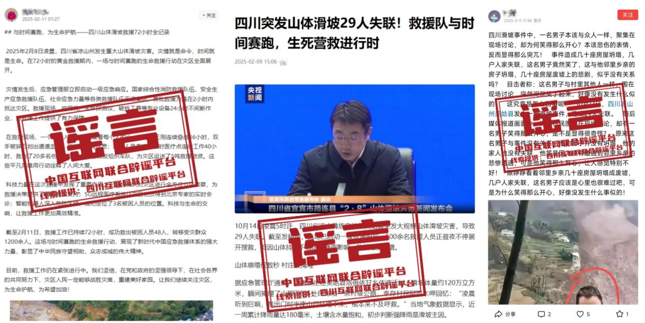 ??詳情:2025年2月8日,四川宜賓筠連發(fā)生山體滑坡已造成1人遇難、28人失聯(lián),2人受傷。全民救援關(guān)鍵時刻,部分網(wǎng)民為吸引流量博取關(guān)注,在網(wǎng)上捏造不實信息、散布災(zāi)情謠言、混淆大眾視聽,不僅擾亂了社會公共秩序,更對救援工作造成困擾。
