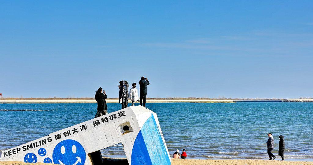2月17日,游客在秦皇島市海港區(qū)金夢海灣沙灘游玩打卡。記者 趙杰 攝