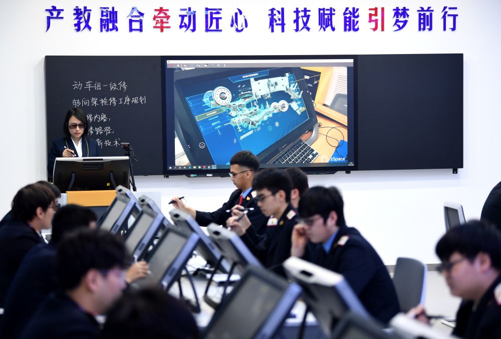 2022年4月29日,在西安鐵路職業(yè)技術(shù)學(xué)院,學(xué)生在動(dòng)車(chē)組VR智慧課堂上模擬檢修。近年來(lái),我國(guó)著力促進(jìn)教育公平,提升教育質(zhì)量,加快推進(jìn)教育現(xiàn)代化,教育數(shù)字化工作持續(xù)推進(jìn)、成果豐碩。
