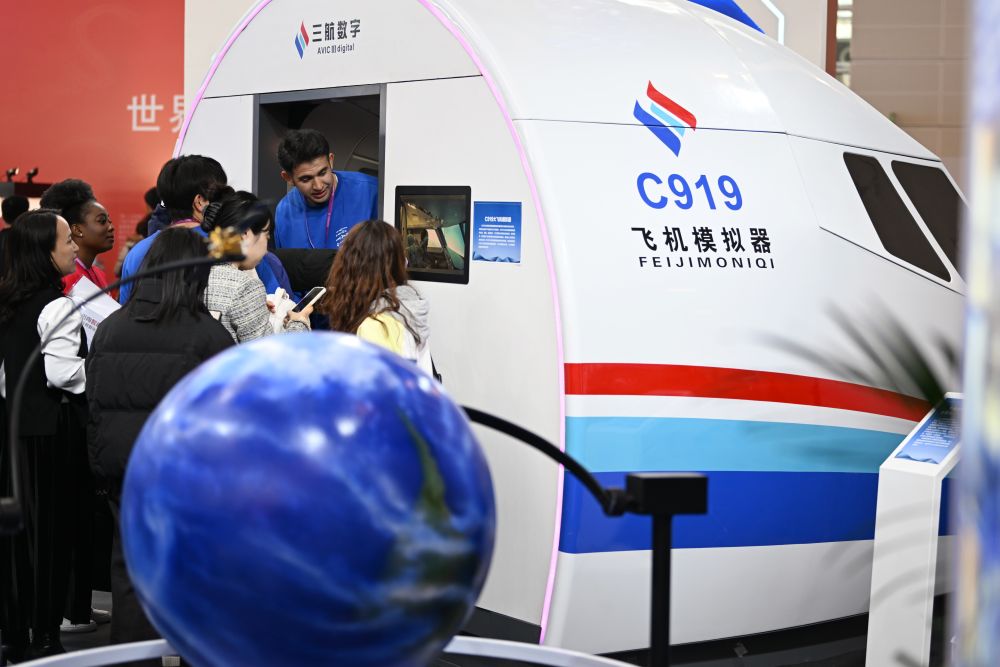 2024年11月21日,參會(huì)者在天津舉行的世界職業(yè)技術(shù)教育發(fā)展大會(huì)專(zhuān)題展上參觀C919飛機(jī)模擬器。展覽設(shè)置了技能塑造人生、技藝傳承文明、服務(wù)產(chǎn)業(yè)升級(jí)、國(guó)際交流合作、產(chǎn)教互融互通等7個(gè)板塊,全方位展示職業(yè)教育改革發(fā)展成果。