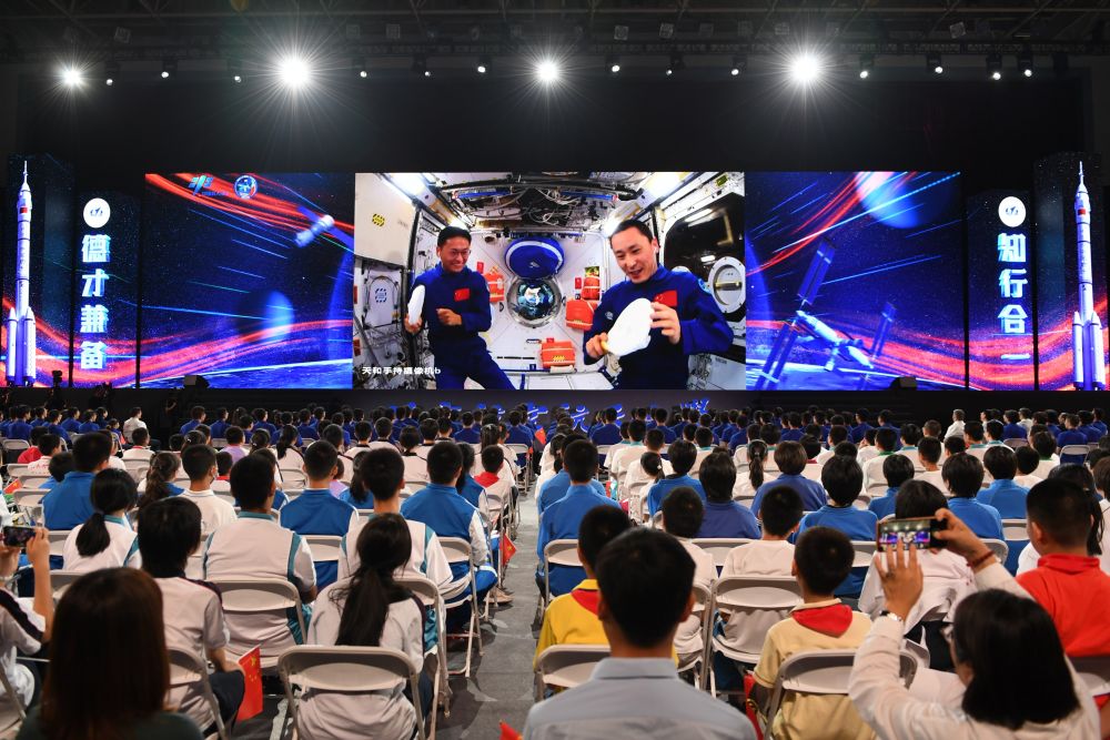 2023年9月21日,在北京航空航天大學(xué),學(xué)生收看“天宮課堂”第四課。神舟十六號(hào)航天員景海鵬、朱楊柱、桂海潮在軌展示介紹中國(guó)空間站夢(mèng)天實(shí)驗(yàn)艙工作生活場(chǎng)景,演示球形火焰實(shí)驗(yàn)、奇妙“乒乓球”實(shí)驗(yàn)、動(dòng)量守恒實(shí)驗(yàn)以及又見(jiàn)陀螺實(shí)驗(yàn),并與地面課堂進(jìn)行互動(dòng)交流。