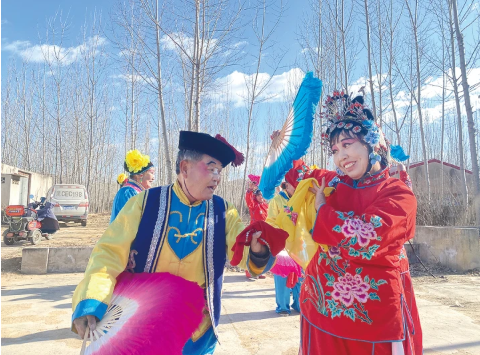 “改良方面,我們借鑒了京劇和其他劇種中的丑角動作和音樂節(jié)奏,將這些元素融入到‘倫派地秧歌’中?!闭f罷,杜慶志做了一個京劇中小生的亮相。“很多人認為秧歌就是快節(jié)奏,其實不是。節(jié)奏快慢有變化,演出才能有層次,觀眾感官上也不容易疲憊,這樣才能做到‘滿堂是戲’?!倍艖c志說,除了動作和節(jié)奏,劇目方面,“倫派地秧歌”推出了《快樂的煙袋》《不忘初心》等新作品,這些作品既保留了傳統(tǒng)秧歌的韻味,又融入了現(xiàn)代元素,“這些創(chuàng)新不僅豐富了‘倫派地秧歌’的表演形式和內容,也為其注入了新的活力和生命力?!?/p>
