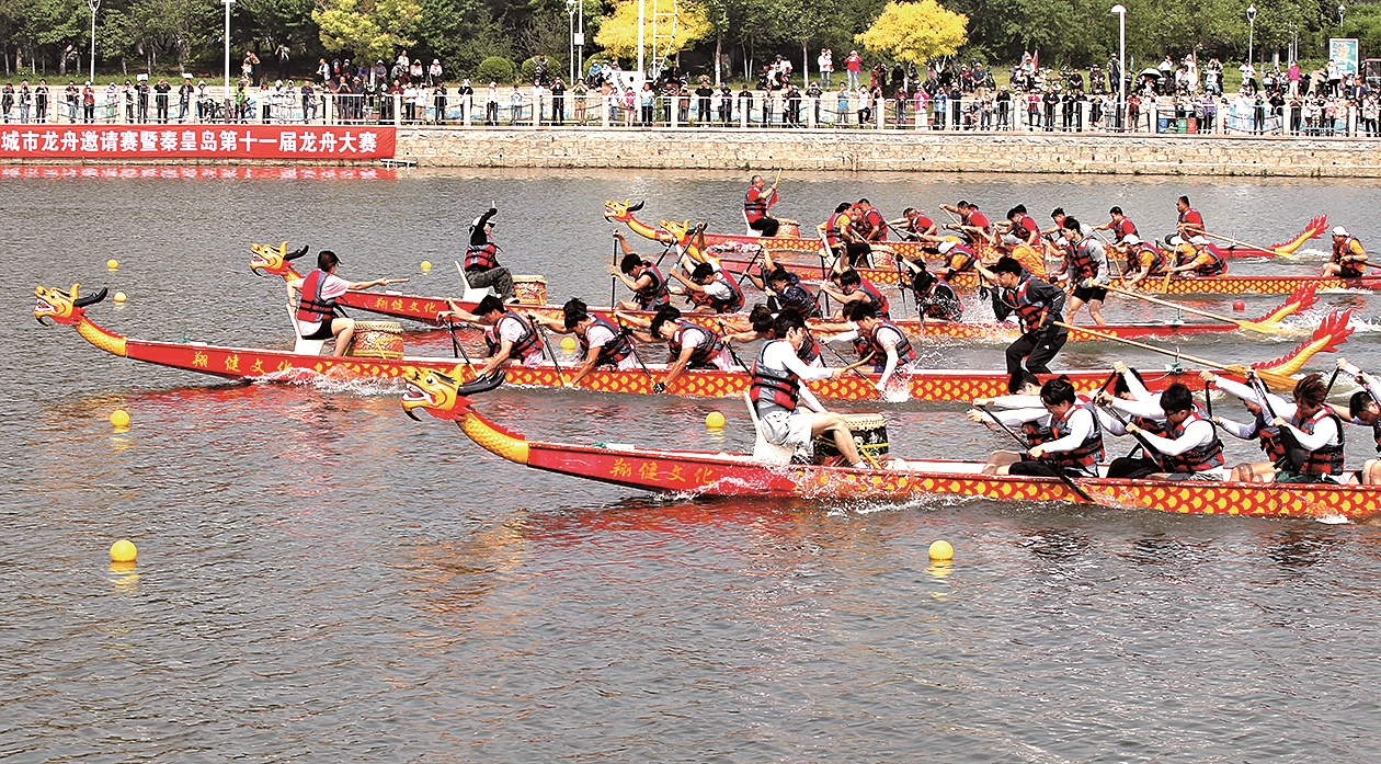 5月29日,選手們在海港區(qū)湯河進行龍舟比賽。當日,由市體育局、海港區(qū)委、海港區(qū)政府主辦的“京津冀環(huán)渤海灣”七城市龍舟邀請賽暨秦皇島第十一屆龍舟大賽在海港區(qū)湯河開賽。比賽設區(qū)直組、院校組、鎮(zhèn)街組、邀請組4個組別,競賽項目為12人龍舟100米、200米兩項。賽事吸引來自北京、天津、石家莊、錦州、秦皇島等地的27支隊伍、400余名運動員參加。賽事當天還舉辦了端午節(jié)文化民俗展。