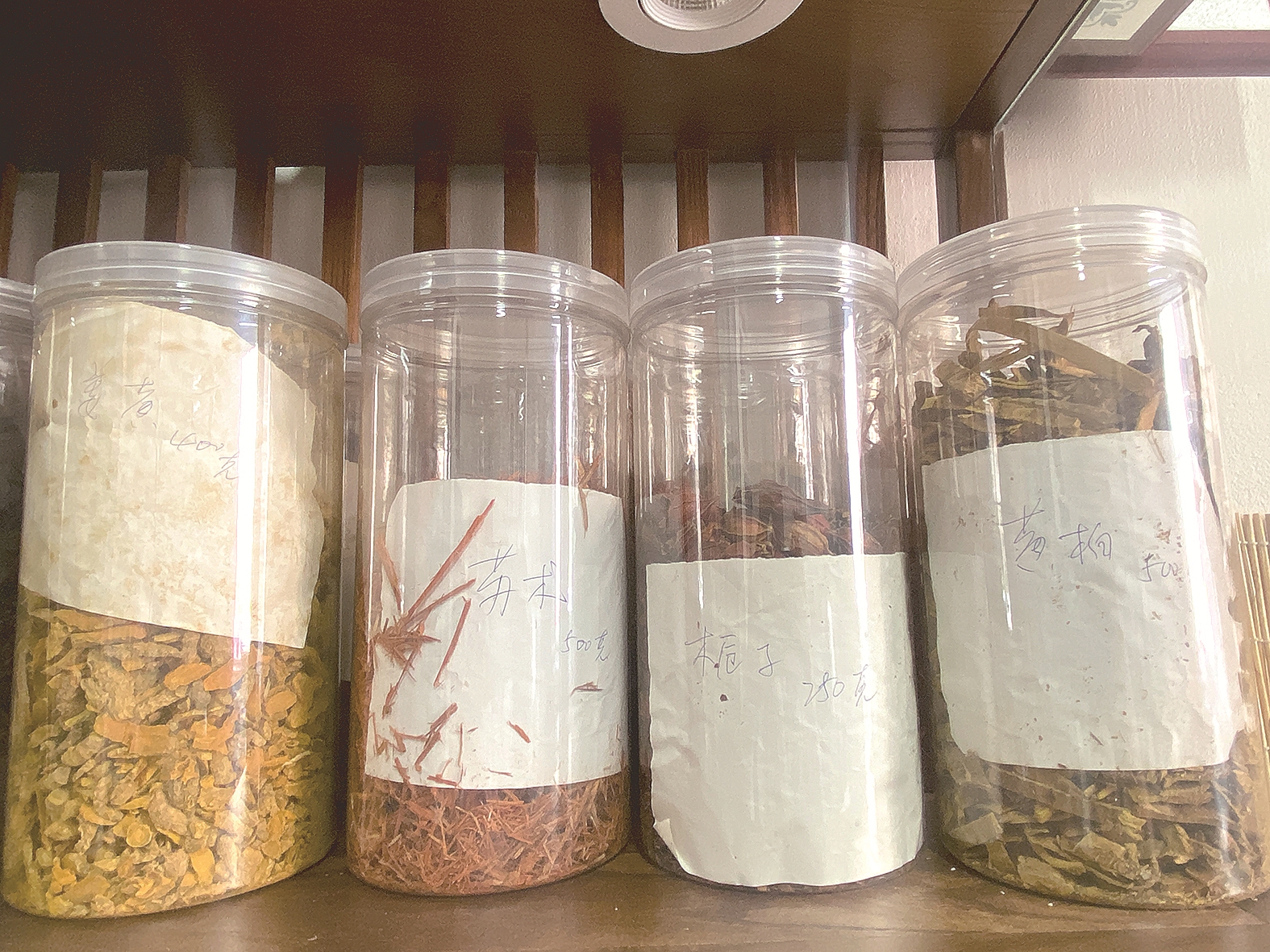 左起:姜黃、蘇術(shù)、梔子、黃柏,這些中藥材都是王博提煉染料的原材料。