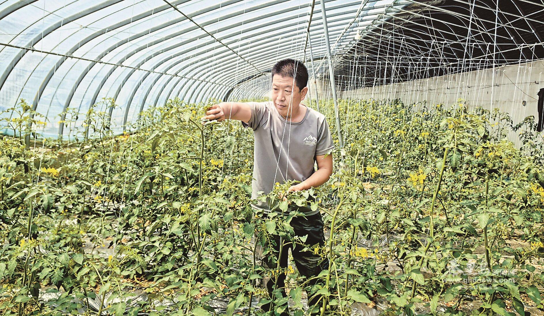 青龍河村村民郭保軍正在為西紅柿藤蔓打尖。河北日報記者孫也達(dá)攝