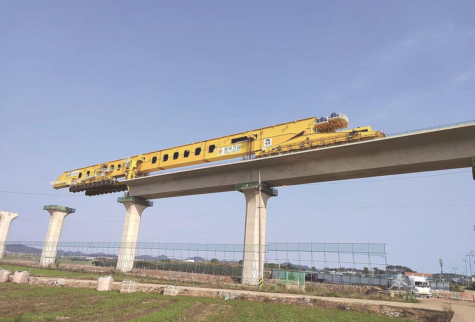 秦皇島天業(yè)通聯(lián)重工科技有限公司自主研發(fā)的架橋機在韓國湖南高速鐵路二期項目工地進行架設(shè)作業(yè)。 (圖片由秦皇島天業(yè)通聯(lián)重工科技有限公司提供)