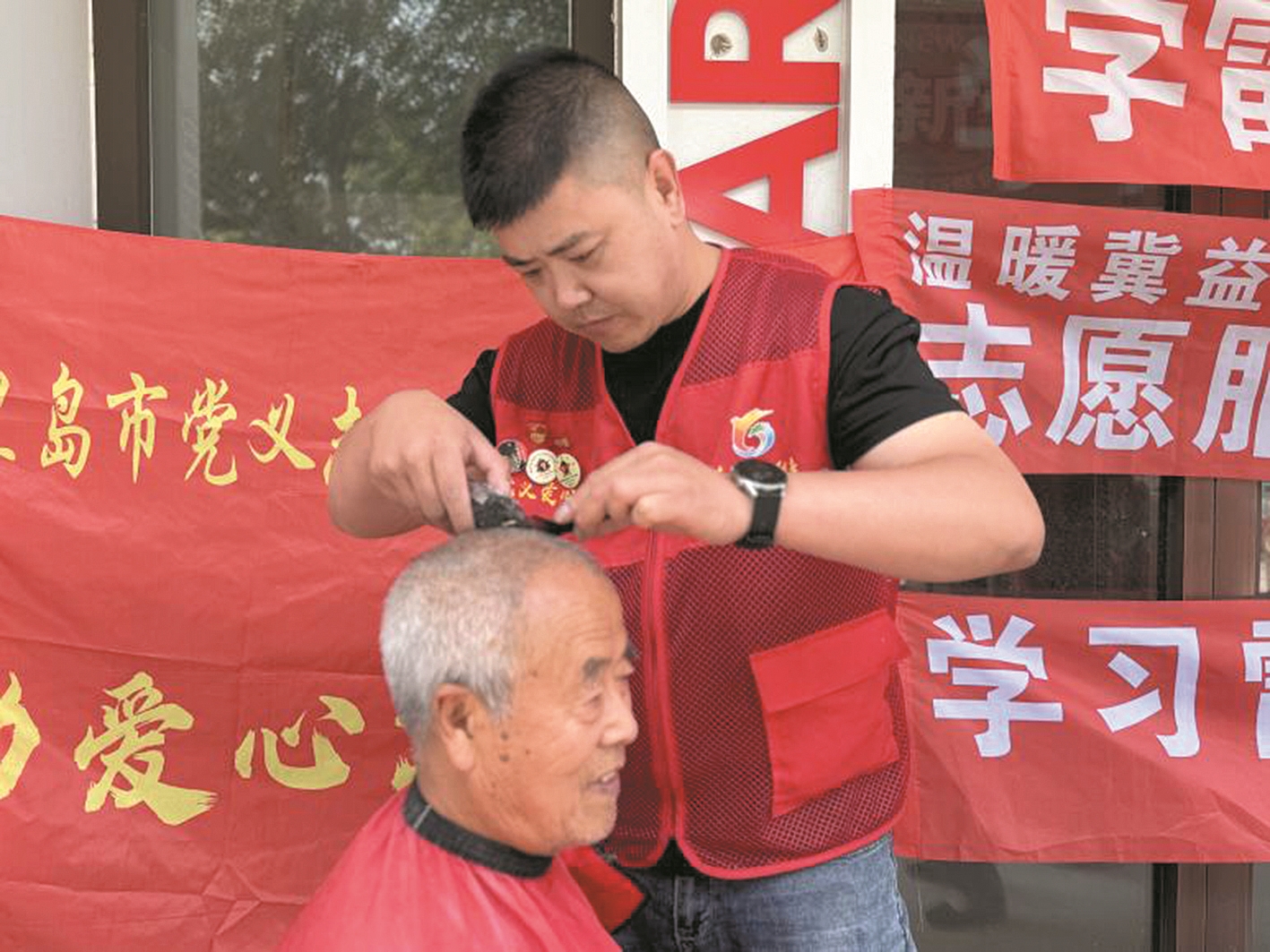 7月的陽(yáng)光漫過(guò)海港區(qū)文香府邸小區(qū)門(mén)前的空地,為黨義志愿者公益服務(wù)中心搭起的便民集市鍍上了一層金色的光芒。人群中,37歲的沈廷偉正全神貫注為老人理發(fā),紅馬甲在光影里晃動(dòng),如同跳動(dòng)的火焰。他胸前別著三枚雷鋒紀(jì)念章,其中一枚是父親沈汝波留給他的珍貴紀(jì)念。