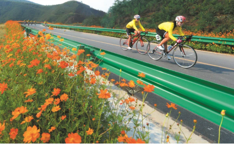 山海關(guān)長城風(fēng)景道上的騎行愛好者。