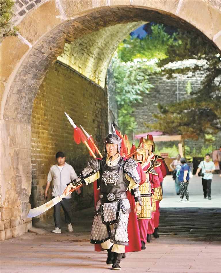 鼓聲未歇,雄關(guān)之下又現(xiàn)森嚴(yán)氣象?!皩⑹垦灿巍标?duì)列如甲片疊壓腳步踏響青石。游客駐足屏息,瞬間置身于這座明代軍事重鎮(zhèn)的中心,威嚴(yán)氣勢(shì)撲面而來(lái)。