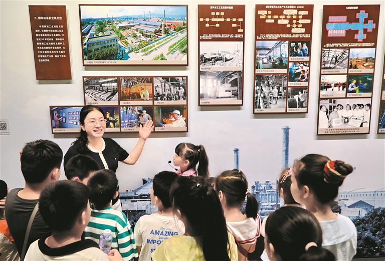 朱紅向?qū)W生介紹中國(guó)玻璃工業(yè)的發(fā)展歷史?。本報(bào)記者劉雙喜攝