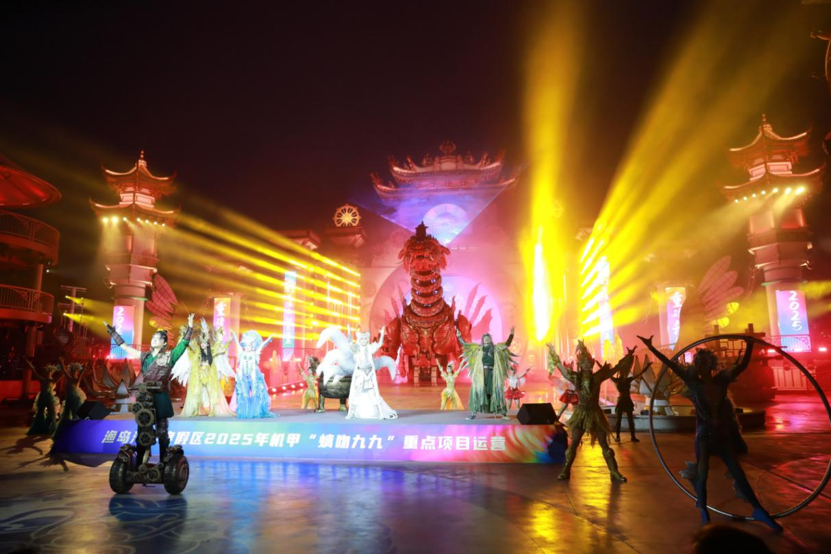 夜幕降臨,國潮仙俠主題街區(qū)被光影點燃,機甲巨獸在《神獸覺醒》演出中破壁而出,“龍子小九”玄幻特效與震撼舞臺讓觀眾腎上腺素飆升。與美國頂尖團隊合作的實景特技秀以末世工廠為背景:火焰、爆破、高空跳水與摩托艇狂飆交織,爆炸近在眼前,水花飛濺臉上,特技演員從高空躍入水中……這場以湖面為舞臺的大戲,融合特技、爆破、聲光電,帶來動作大片級的沉浸震撼。年輕人被卷入“戰(zhàn)場”中心,腎上腺素飆升的快感讓他們大呼過癮。