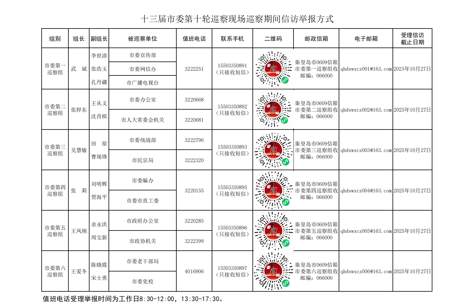 據(jù)悉,市委巡察組將在被巡察單位工作50天左右。6個巡察組將專門設(shè)置值班電話、郵政信箱、電子信箱、信訪受理專用二維碼和固定聯(lián)系信箱,主要受理關(guān)于被巡察單位落實(shí)黨中央決策部署及省市委工作要求,履行全面從嚴(yán)治黨責(zé)任,領(lǐng)導(dǎo)班子、干部人才隊伍和基層黨組織建設(shè),巡察、審計等監(jiān)督發(fā)現(xiàn)問題整改等方面問題。受理被巡察單位領(lǐng)導(dǎo)班子及其成員、下一級黨組織領(lǐng)導(dǎo)班子主要負(fù)責(zé)人和重要崗位領(lǐng)導(dǎo)干部問題的來電來信來訪,重點(diǎn)是關(guān)于違反政治紀(jì)律、組織紀(jì)律、廉潔紀(jì)律、群眾紀(jì)律、工作紀(jì)律、生活紀(jì)律以及違反中央八項(xiàng)規(guī)定精神等方面的舉報和反映。對關(guān)于個人訴求、涉法涉訴等問題的反映,將按照分級負(fù)責(zé)、屬地管理原則,移交有關(guān)單位處理。巡察組受理信訪時間截止到2025年10月27日。