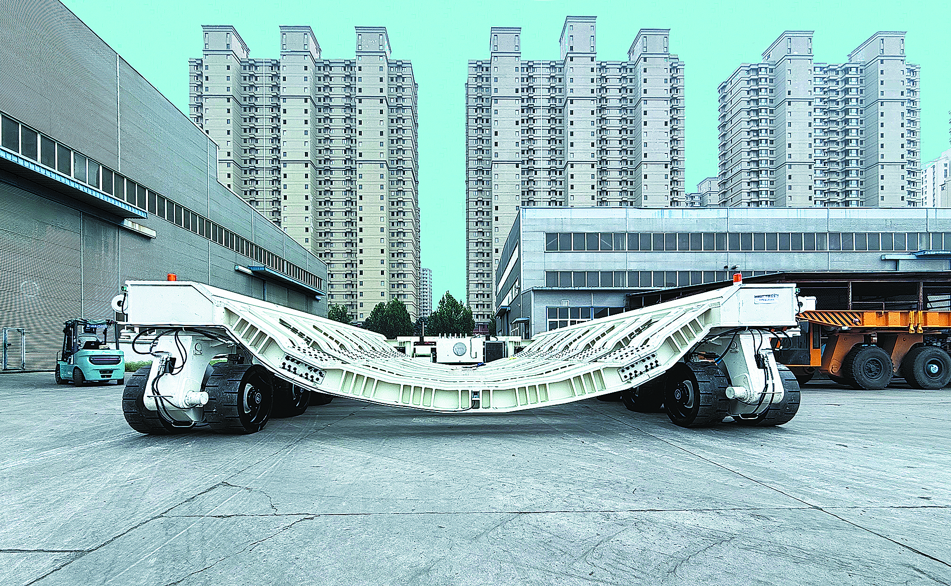 由秦皇島天業(yè)通聯(lián)重工科技有限公司設(shè)計(jì)研發(fā)的世界首臺(tái)八百噸級(jí)盾構(gòu)機(jī)平移特種車輛正式下線。 (圖片由天業(yè)通聯(lián)提供)