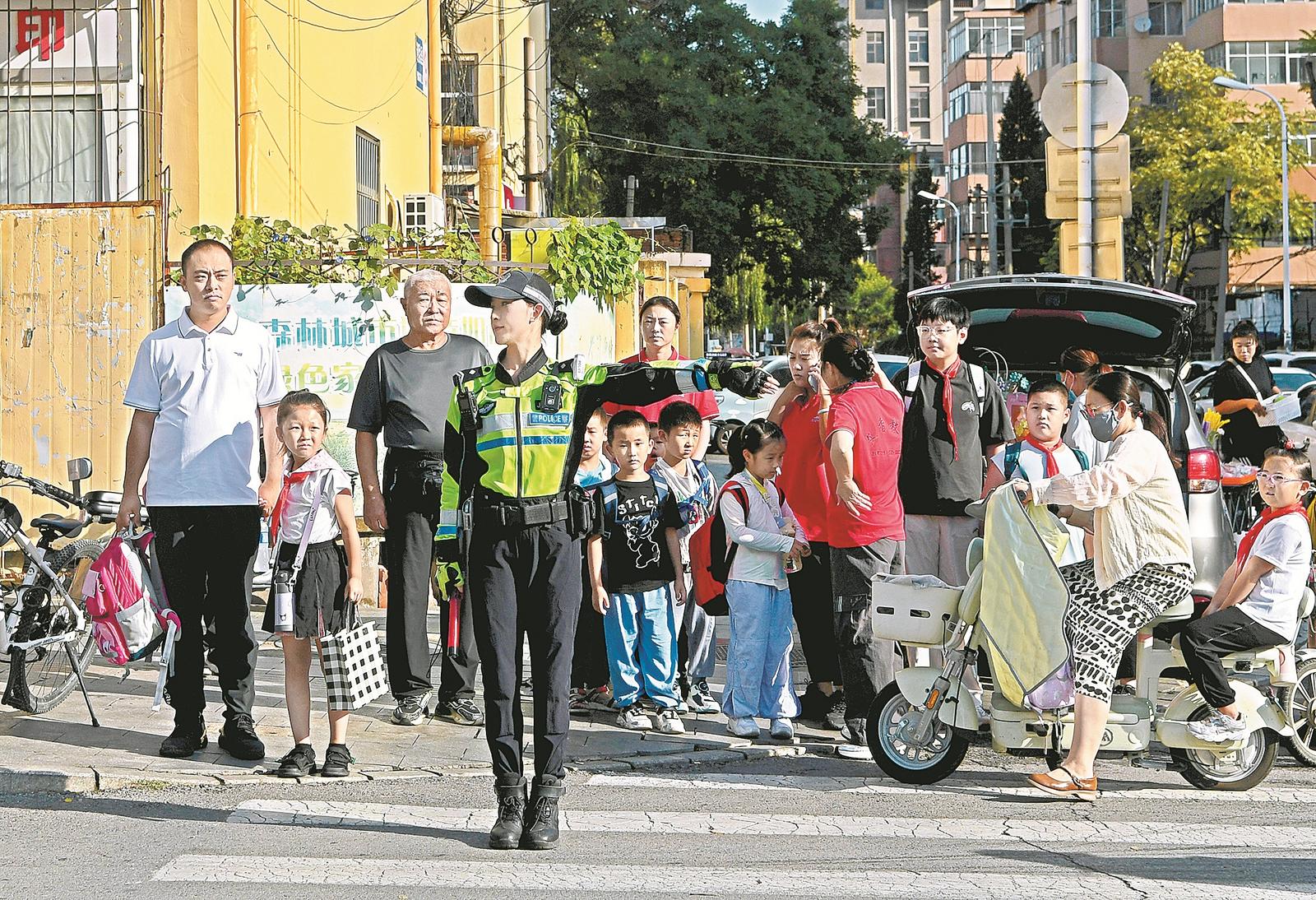 市公安局交警支隊(duì)機(jī)動(dòng)大隊(duì)民警在海港區(qū)迎秋里實(shí)驗(yàn)學(xué)校門(mén)口執(zhí)勤。記者 方竟凱 攝