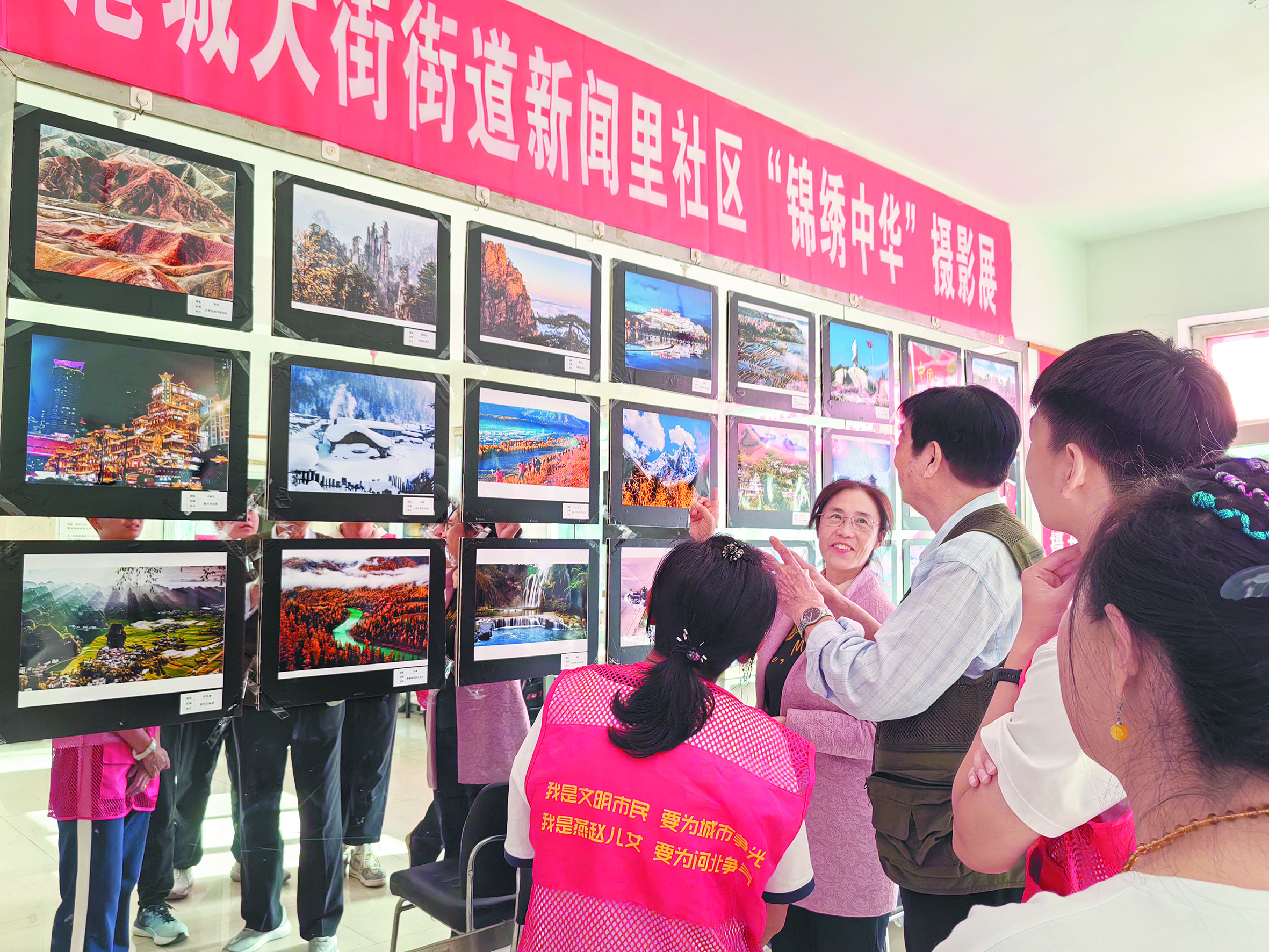 新聞里社區(qū)居民在參觀“錦繡中華”攝影展。