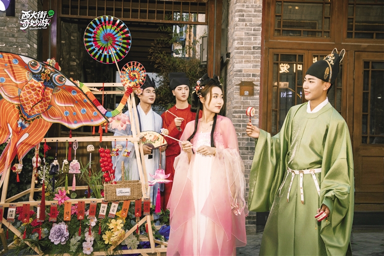 作為古城文化地標(biāo),西大街此次以“沉浸互動(dòng)”為核心,推出多元體驗(yàn)。10月1日至8日17:00-22:00,“雙節(jié)奇妙游”活動(dòng)持續(xù)上演。6大故事主演NPC身著宋代服飾穿梭街區(qū),與游客開(kāi)展猜燈謎、學(xué)古禮等線下挑戰(zhàn),參與者可贏取可抵扣街區(qū)消費(fèi)的“銀票”。活動(dòng)同步開(kāi)啟線上直播,讓未到場(chǎng)市民也能“云游”古街。