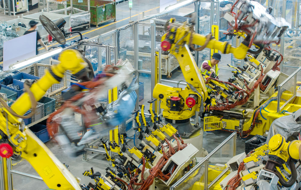 浙江省湖州市長興經(jīng)濟(jì)技術(shù)開發(fā)區(qū)的長興地通汽車部件有限公司技術(shù)人員操控工業(yè)機(jī)器人生產(chǎn)新能源汽車配件(無人機(jī)照片,2025年10月9日攝)。新華社發(fā)(譚云俸 攝)