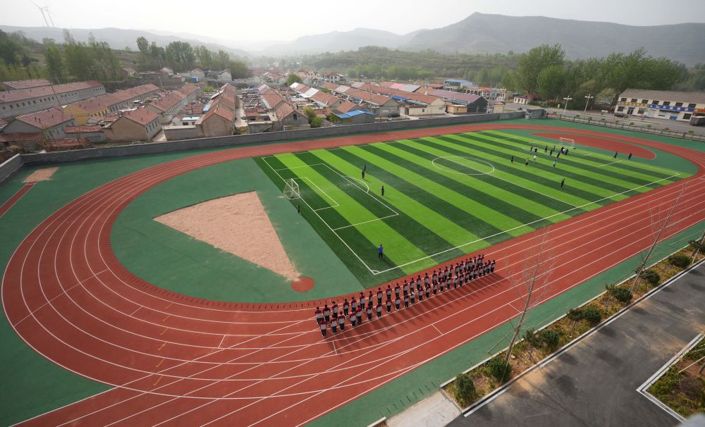 在位于山東濰坊市臨朐縣石家河村的臨朐縣彌水教育集團(tuán)石家河校區(qū),學(xué)生在操場塑膠跑道上進(jìn)行體育鍛煉(2025年4月17日攝)。新華社記者 徐速繪 攝