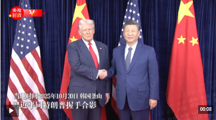 當(dāng)?shù)貢r間10月30日中午,中美元首會晤開始前,習(xí)近平同特朗普握手合影。