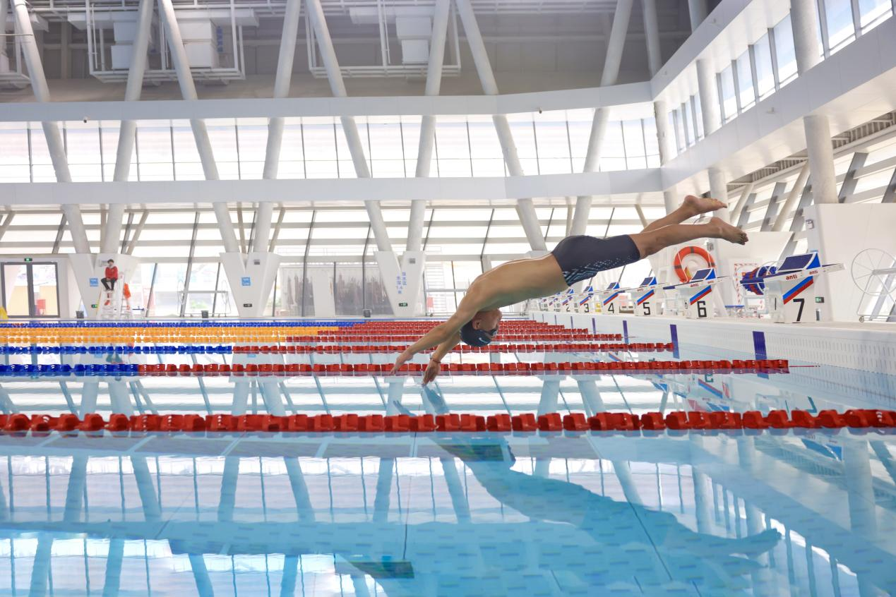 雄安體育中心游泳館救生員張雷在進行游泳訓練。人民日報記者 蔣雨師 攝