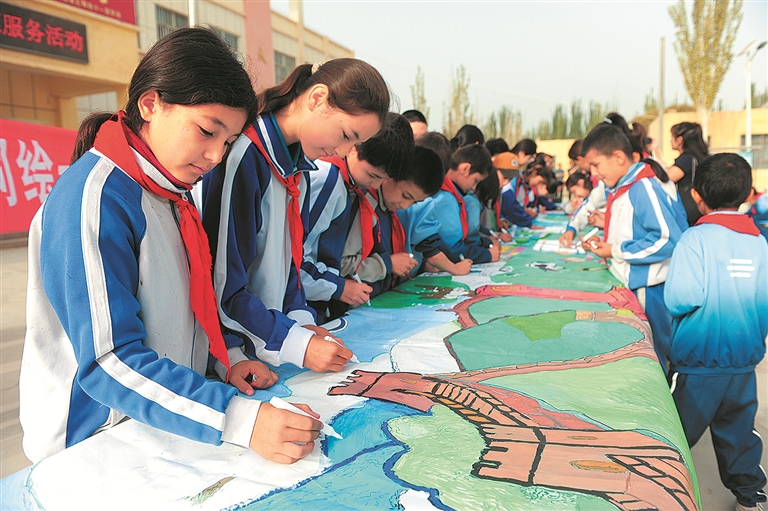 “小海星”志愿服務隊隊員與新疆阿克陶縣塔爾塔吉克民族鄉(xiāng)中心小學的學生開展“同繪一幅畫”活動。通訊員 呂越豐 攝