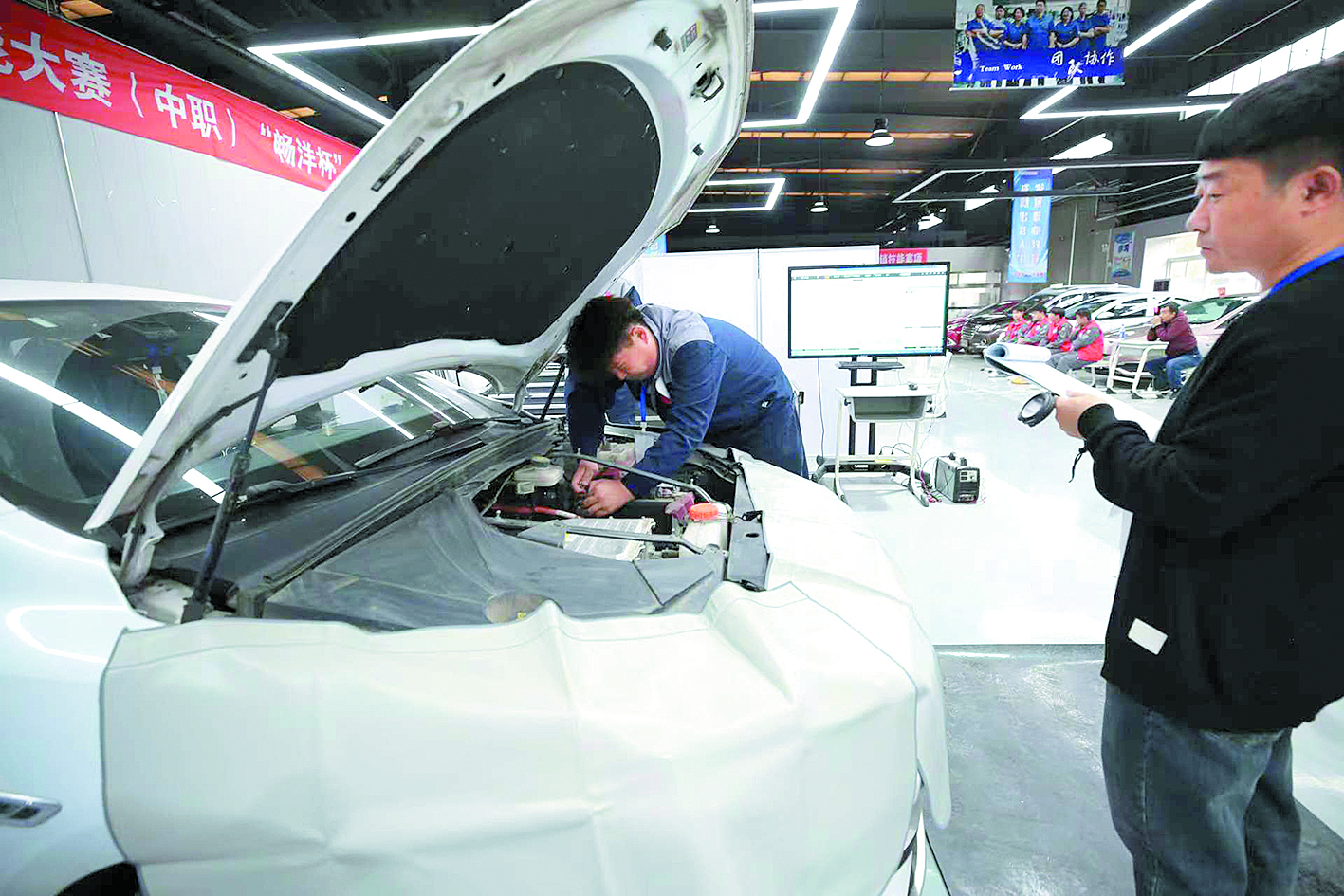 在全市校企聯(lián)合職業(yè)技能大賽現(xiàn)場,選手正在進(jìn)行車輛維修技能競賽的比拼。(圖片由市教育局提供)