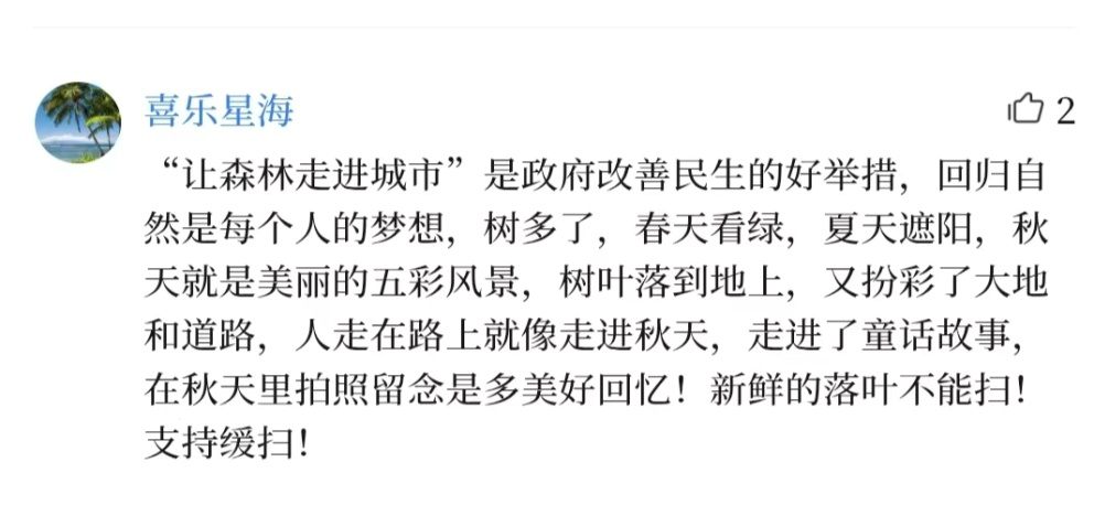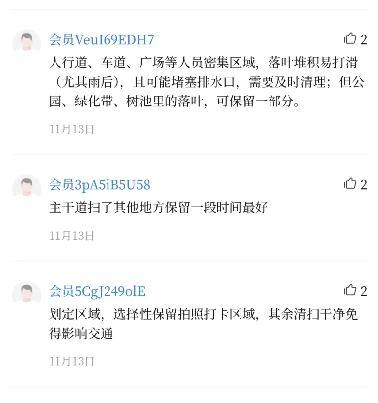 不少網(wǎng)友建議吸取其他城市管理經(jīng)驗(yàn),分區(qū)域、分場景治理,核心交通路段、人員密集區(qū)域需及時(shí)清掃,公園、綠化帶等區(qū)域可適度保留,實(shí)現(xiàn) “安全與美景兼顧”。