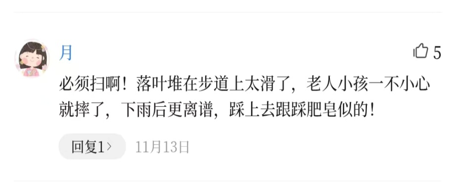 與此同時(shí),部分市民更關(guān)注安全與通行需求,主張 “及時(shí)清掃”。市民 “月” 直言:“落葉堆在步道上太滑了,老人小孩容易摔倒,下雨后更危險(xiǎn)!”
