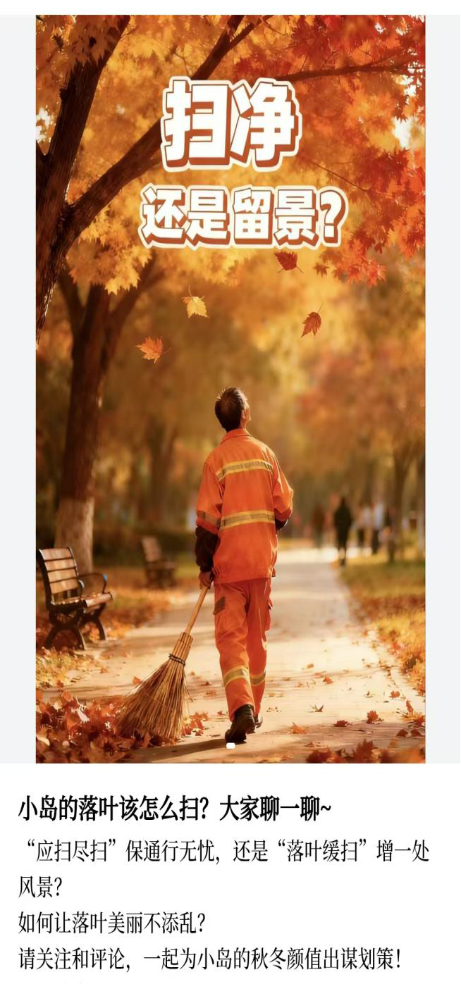 “應(yīng)掃盡掃保通行,還是緩掃落葉添美景?” 近期,秦來 APP“秦見”頻道發(fā)起 “小島的落葉該怎么掃?” 的話題,引發(fā)市民廣泛關(guān)注與熱烈討論,大家各抒己見為城市管理出謀劃策,相關(guān)部門也通過平臺(tái)作出積極回應(yīng)。