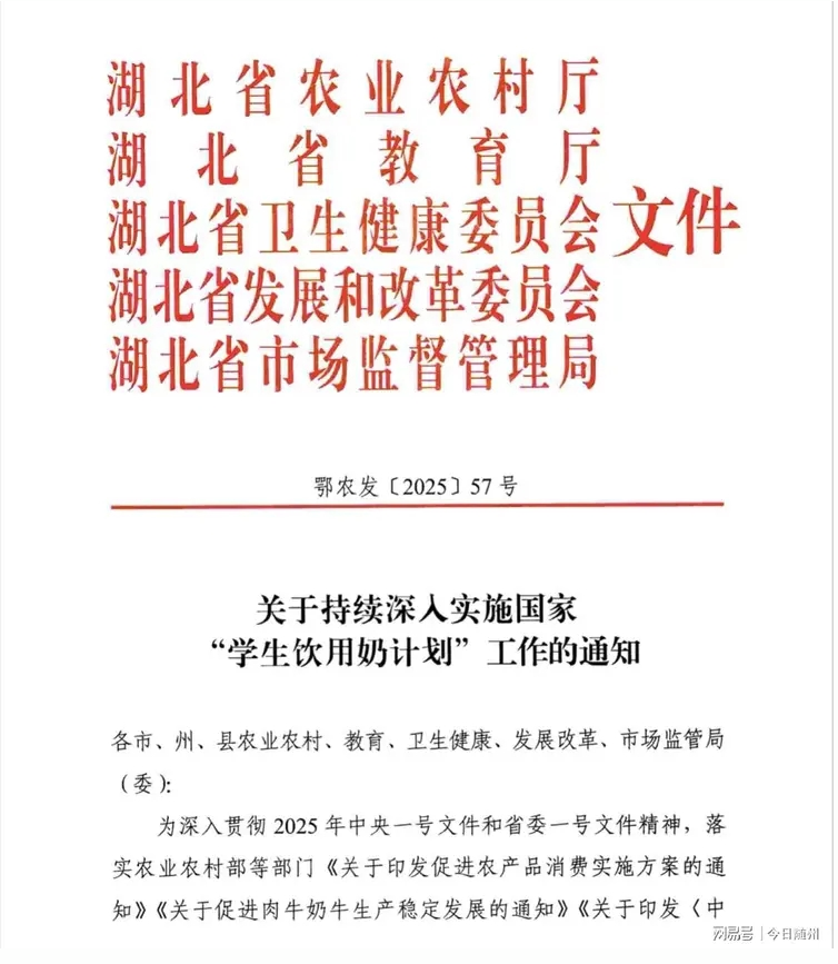 為深入貫徹2025年中央一號文件和省委一號文件精神,落實農(nóng)業(yè)農(nóng)村部等部門《關(guān)于印發(fā)促進農(nóng)產(chǎn)品消費實施方案的通知》《關(guān)于促進肉牛奶牛生產(chǎn)穩(wěn)定發(fā)展的通知》《關(guān)于印發(fā)〈中國食物與營養(yǎng)發(fā)展綱要(2025—2030)〉的通知》有關(guān)要求,持續(xù)深入實施“國家學(xué)生飲用奶計劃”,拉動牛奶消費,改善學(xué)生體質(zhì)狀況,持續(xù)推動奶業(yè)全產(chǎn)業(yè)鏈高質(zhì)量發(fā)展,現(xiàn)就有關(guān)工作要求通知如下。