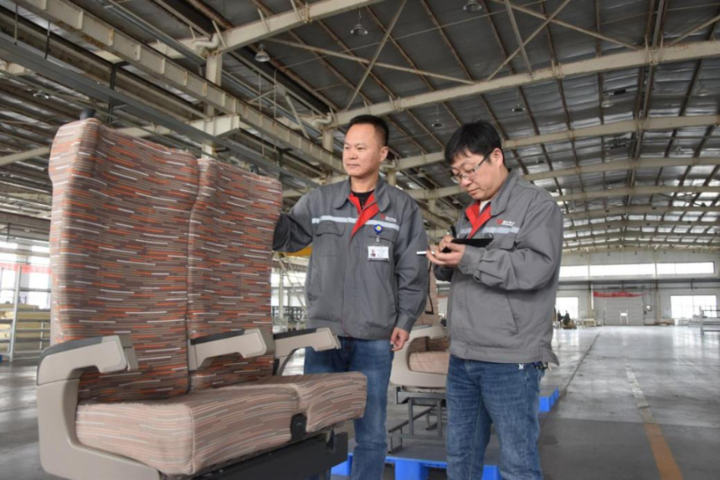 2025年10月10日,唐山華達(dá)軌道交通裝備有限責(zé)任公司的技術(shù)人員測(cè)試座椅。新華社發(fā)
